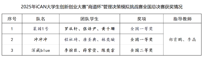 本次大赛由iCAN大学生创新创业大赛组委会主办、黄山学院承办,自2025年4 月启动以来,吸引了全国超500所高校的3万多支队伍参赛 ,经过校赛、区域赛、全国初赛的层层选拔,全国近400支队伍1500多名师生晋级总决赛。总决赛赛采用虚拟仿真企业管理决策对抗与答辩路演相结合的方式,全方位考察参赛学生的商业思维、决策分析、团队协作和临场应变等综合能力素质。我校共有3支参赛团队从众多参赛队伍中脱颖而出 ,成功晋级全国总决赛 。其中由罗从轩、张译尹、黄千珊组成的“菜园1号” 队和由程祉琦、唐圣典、林奕璇组成的“冲冲冲队”荣获全国一等奖,由李煊臣、薛紫萱、 陈奕霏组成的“深藏blue”队荣获全国二等奖 。学校荣获优秀组织奖 ,郑霄鹏、李晶获优秀指导教师奖。