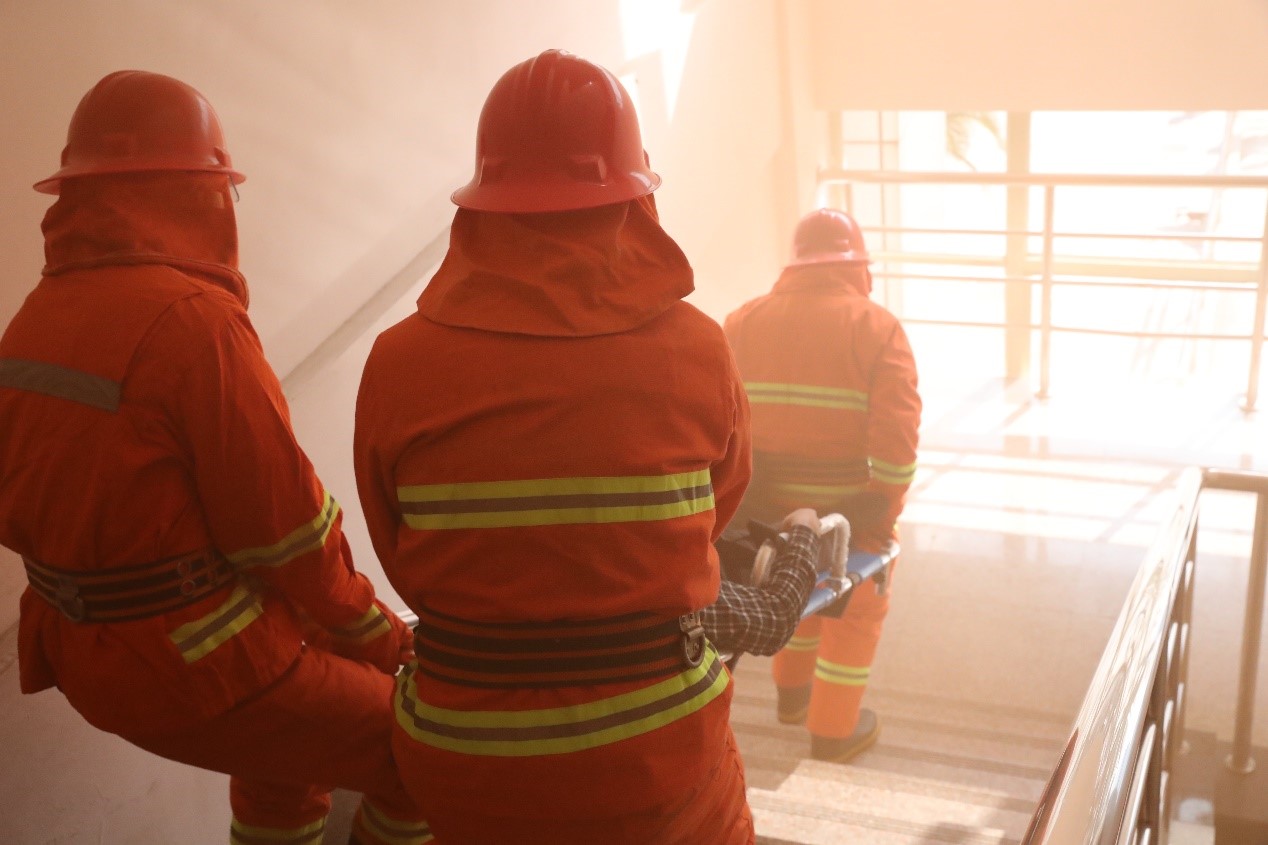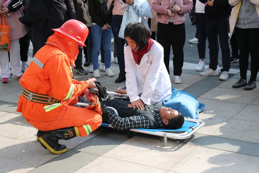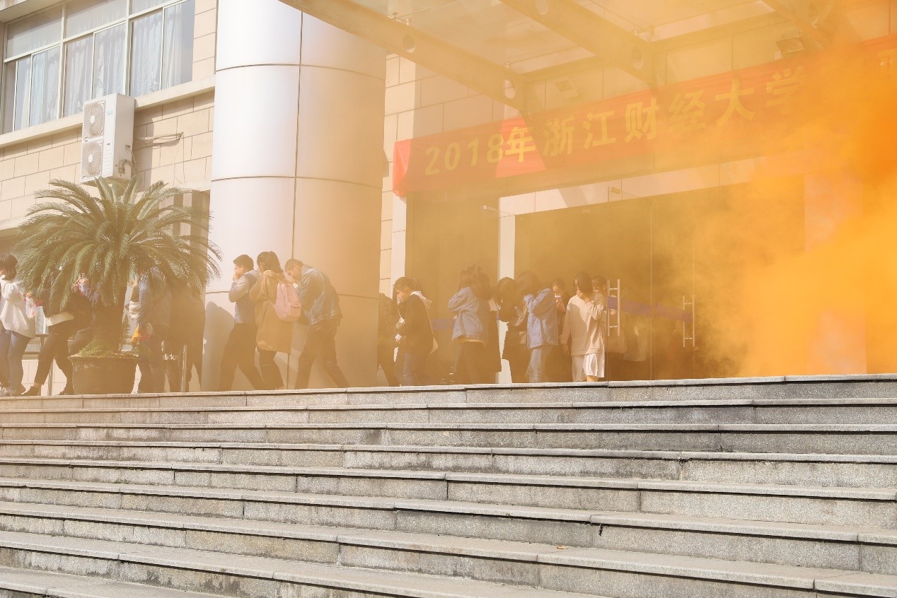 随着烟雾弹点燃,演练正式开始,科技楼内报警装置启动,学校保卫处消防中心接到火警信号后,立即开启消防应急预案。在第一时间内,楼内实验室管理人员立即引导学生用毛巾捂住口鼻、弯腰降低重心,沿着规定逃生路线有序疏散,快速逃离至一楼安全区域,演练中,校内微型消防站消防人员还向在场师生开展了人员搜救、伤员救护、灭火器使用、水枪打靶等演练。整个演练过程安全、有序,取得圆满成功。