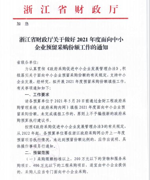 《浙江省财政厅关于做好2021年度面向中小企业预留采购份额工作的通知20210430》