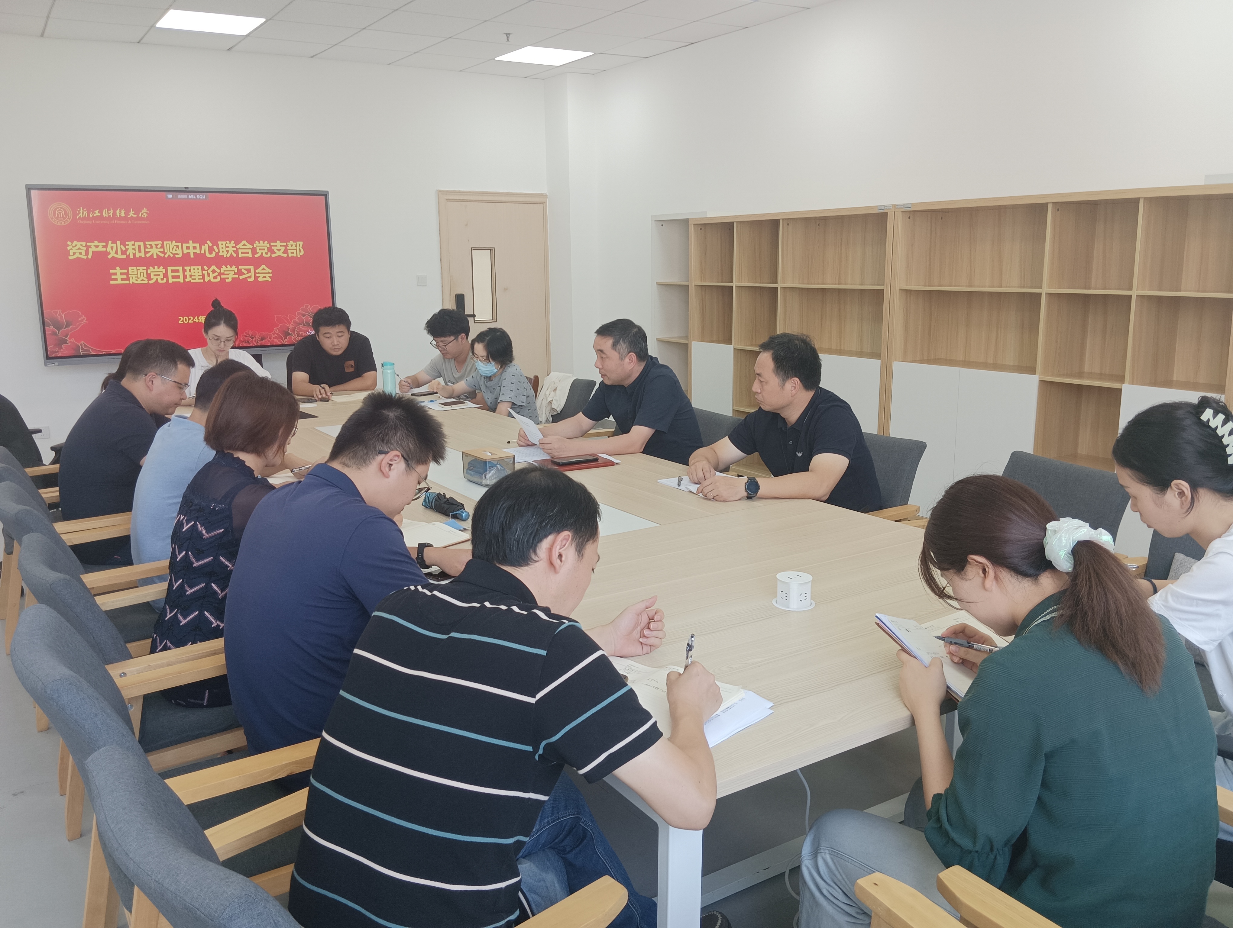 近日,资产处和采购中心联合党支部召开主题党日理论学习会,专题学习贯彻省委十五届五次全会精神和学校2024年暑期中层及以上干部理论学习会精神。会议由党支部书记王聪主持。