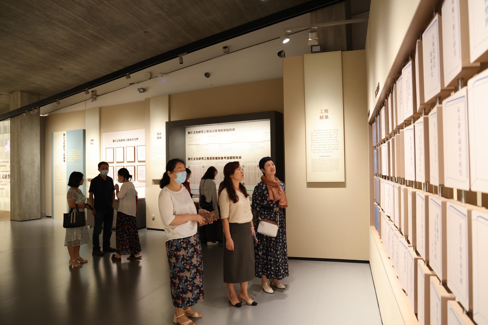 在国家版本馆,大家认真参观,透过一件件珍贵展品,感受中华民族的智慧和文化,汲取蕴含其中生生不息的力量。大家依次参观了“文献之邦——江南版本文化概览展”“盛世浙学——浙江文化研究工程成果展”“千古风流——浙江历史文化名人展”与“潮起之江——‘重要窗口’主题版本展”四个主题展览。特别是“盛世浙学——浙江文化研究工程成果展”,定位于赓续文脉,呈现了习近平总书记的文化情怀,凸显“浙江精神”在编纂中的引领作用,分为工程概览、浙江历史文化研究、浙江文献整理、中国历代绘画大系、浙江名人研究、浙江当代发展研究等6个单元,汇聚图书、影像、模型、图片、多媒体等重要版本1000余件,首次梳理了浙江文化研究工程的学术脉络,是生动展现这一盛世工程的重要成果。